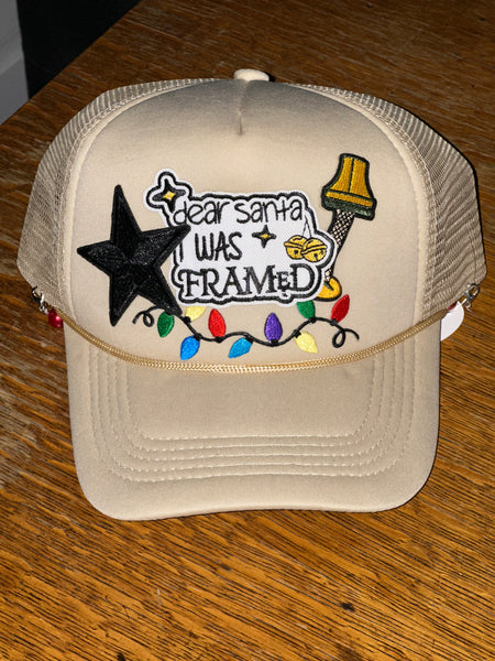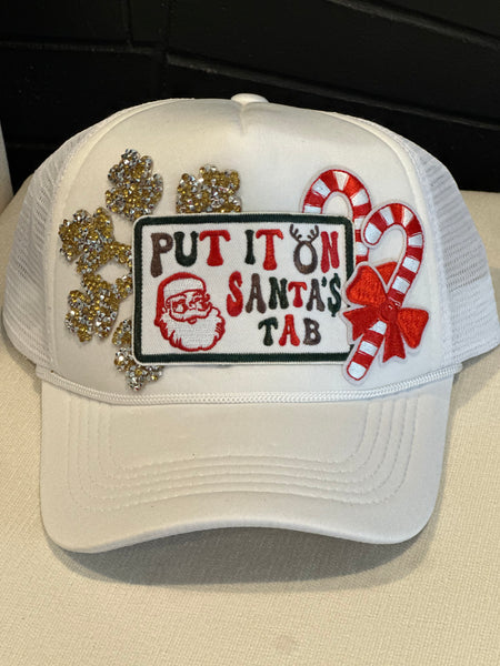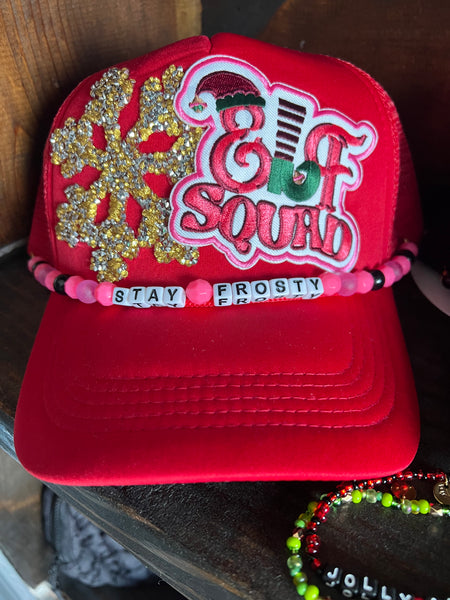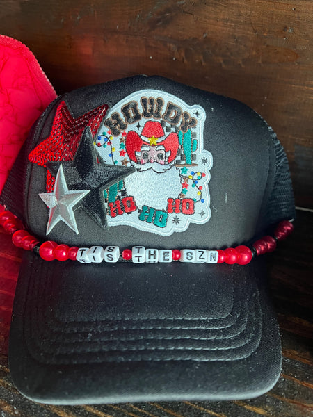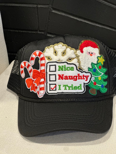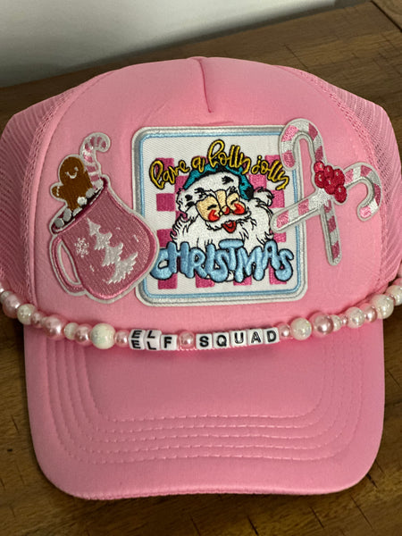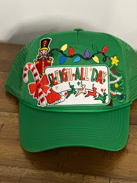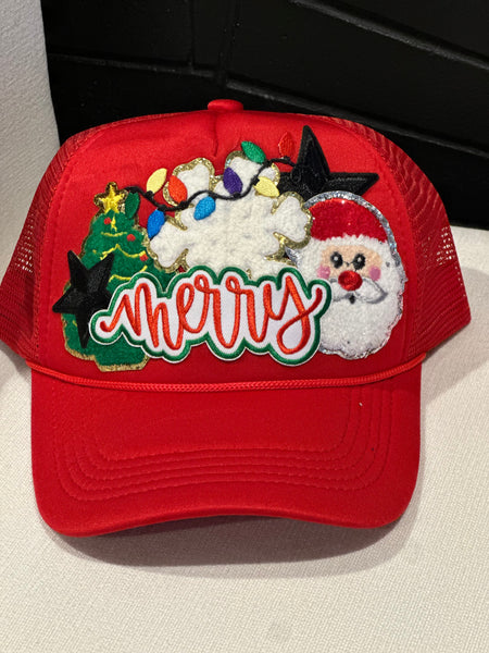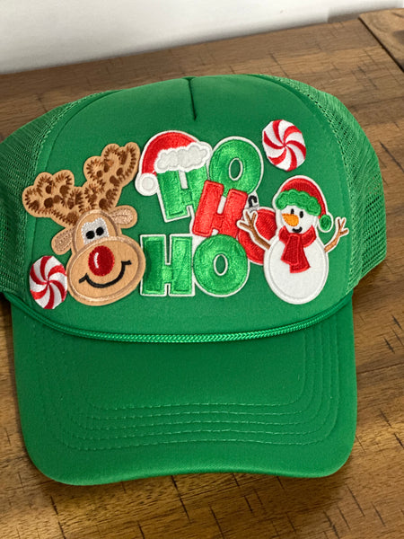 Holiday trucker hat with patches and chain