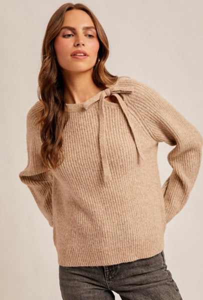 Stay cozy while looking chic in this timeless knit sweater.✨ Designed in a soft ribbed fabric, it features long sleeves, a relaxed fit, and a delicate bow tie detail at the neckline for a subtle, feminine twist. The warm neutral hue makes it a versatile piece—perfect for pairing with denim for a casual day look or dressing up with trousers and boots for a polished finish.